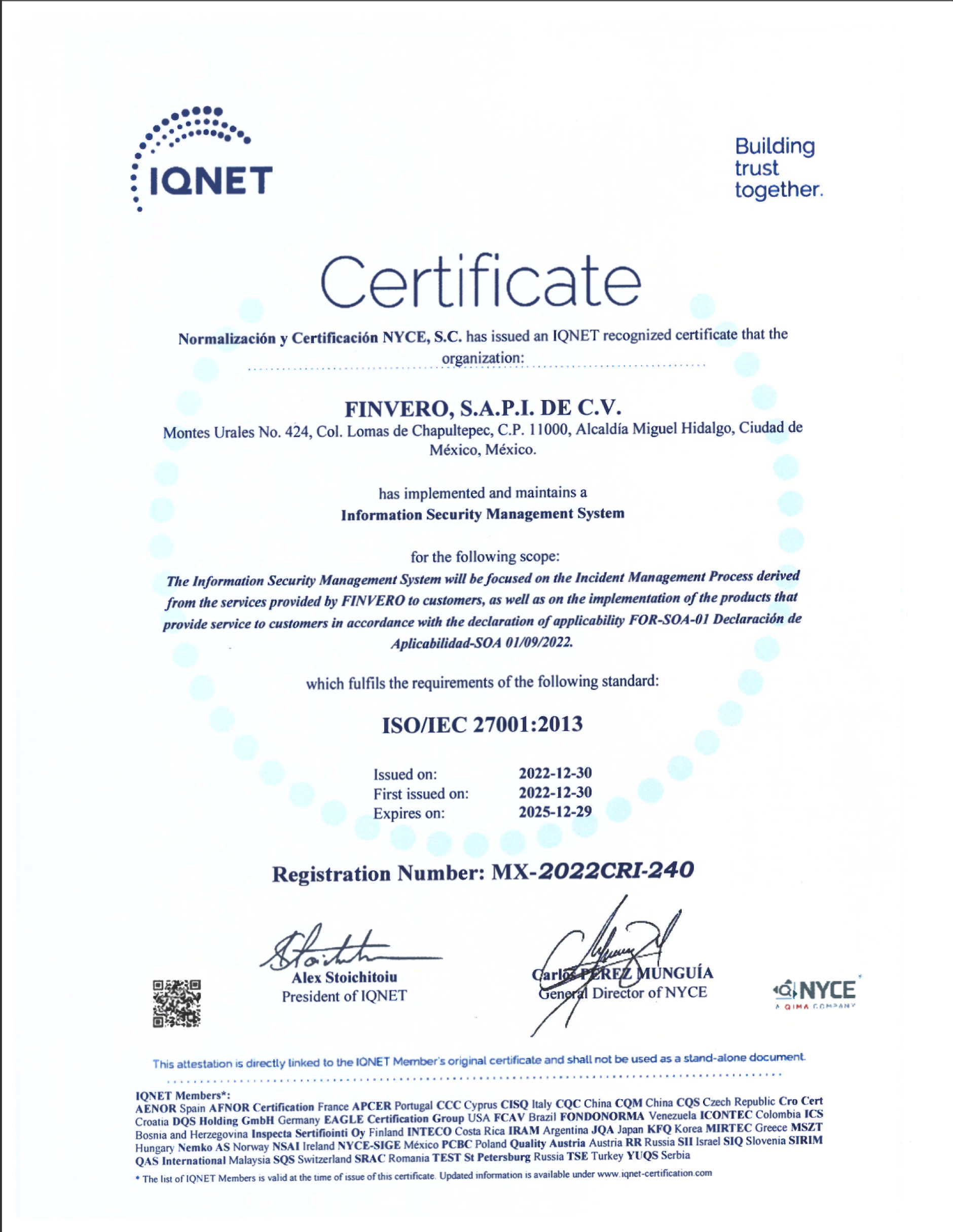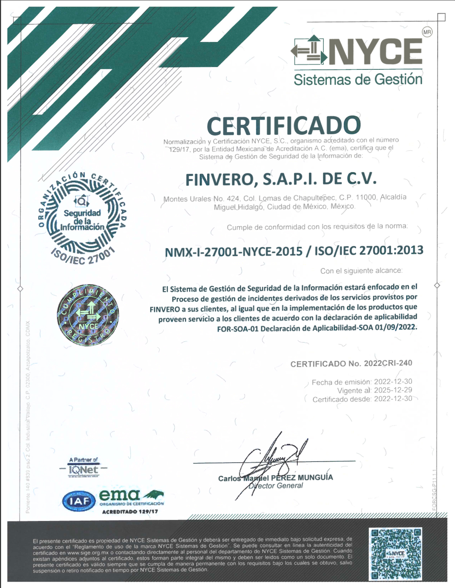 En finvero estamos comprometidos con la Seguridad de la Información de nuestros clientes, al integrar los procesos, tecnología y personal que nos permitan gestionarla para garantizar los objetivos estratégicos, así como la confidencialidad, integridad y disponibilidad de esta, apegándonos al marco legal y trabajando en la mejora continua del Sistema de Gestión de la Seguridad de la Información, acorde con la norma internacional ISO/IEC 27001:2022
